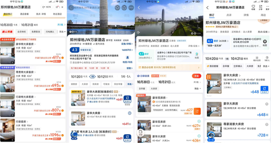 去哪個平臺訂這些萬豪系酒店,能讓小夥伴更加省錢呢?以鄭州綠地JW萬豪酒店為例,潘哥登錄飛豬、美團、去哪兒、攜程四款App,發現同日期同房型的平臺售價,分別為617元、649元、627元和648元。
