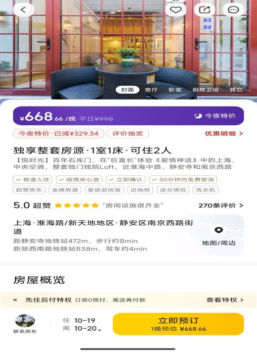 潘哥發現,雖然酒店行業整體低迷,但好的民宿價格依舊堅挺。位於上海靜安的一間石庫門,一室一牀的民宿房間,在美團上售價669元,對比附近的上海靜安萬楓酒店,一晚389元的價格,貴了280元。