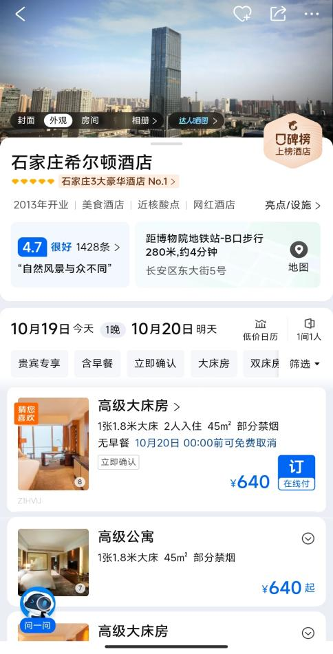 比如,石家莊希爾頓酒店,45平米的高級大牀房,如今在攜程上售價640元;而在2019年,有網友表示,自己外出旅行時,在攜程上預定這家酒店,發現最便宜的房間,也要700多元一晚。