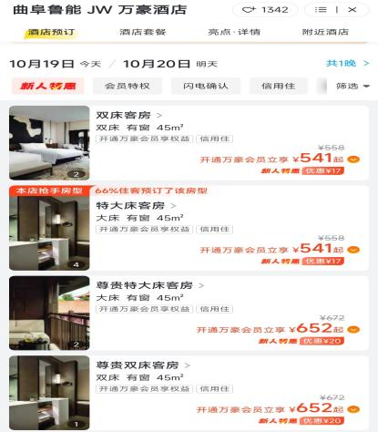 在飛豬、美團、去哪兒上,200元的甘肅白銀萬楓、239元的鄭州上街雅樂軒、617元的鄭州綠地JW萬豪、541元的曲阜魯能JW萬豪、甚至三四百元的上海萬豪系酒店,讓潘哥心動不已。