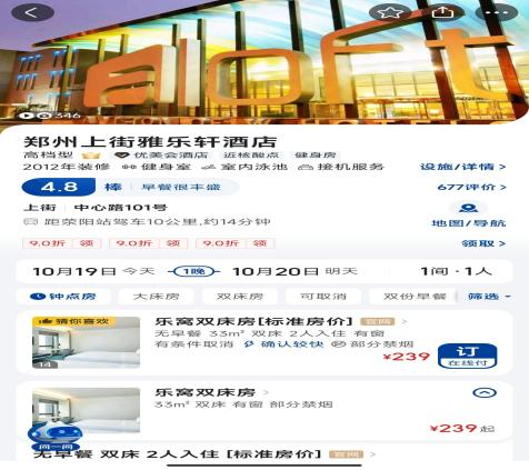 同樣在今年6月,有網友在小紅書曬圖,美團上的鄭州上街雅樂軒酒店,最便宜的房間一晚售價466元,對比現在239元的售價,降價接近一半。