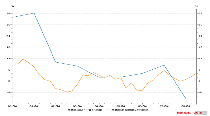①1981年墨西哥經濟年均增長在9%左右,但外債總額同比增速卻在30%以上,遠超GDP增速。