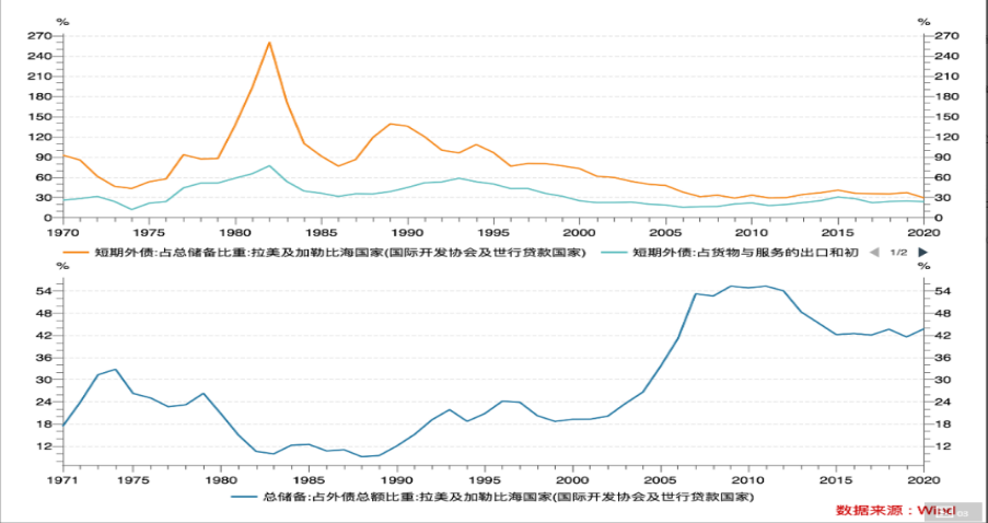 根據世界銀行數據,拉美及加勒比海國家總儲備佔外債總額的比重明顯提升,80年代拉美危機時不到10%,2020年底上升到42%;短期外債佔總儲備、貨物與服務出口的比重均大幅下降至30%以下。
