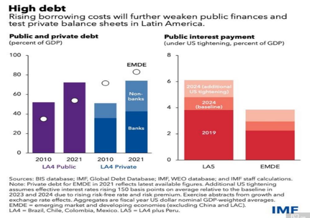 高利率和商品價格下跌自然會對其經濟造成負面衝擊。IMF預計,明年南美、墨西哥和一些加勒比經濟體等大宗商品出口國的增長率可能會減半,因為大宗商品價格下跌會放大利率上升的影響。