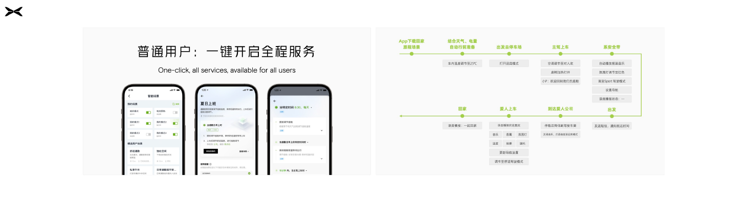 智能場景是小鵬智能座艙的全新自定義能力,讓用户擁有專屬的座艙功能服務。它將行業領先的整車能力原子開放,創造無限用車場景,讓用户可以定義自己的智能汽車。同時,率先研發的遠程智能場景,用户不在車上時,車輛依然可根據自身感知能力,繼續執行用户定義的場景;多個場景之間,可根據上一個場景的執行結果,並主動判斷串聯后續場景,滿足用户整個行程周期的全時需求;普通用户可直接選擇自己喜歡的場景,一鍵開啟全程服務,並支持社區、社媒傳播和跨車型繼承;極客用户更可深度參與共創,一鍵串聯開拓想象。