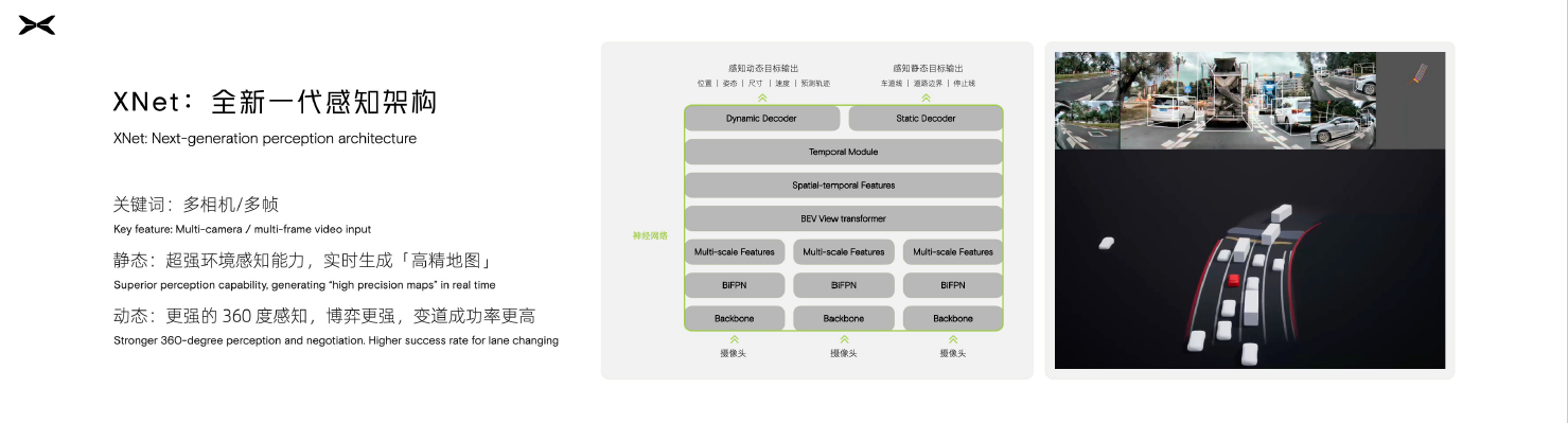 其中,XNet 深度視覺神經網絡將多個攝像頭採集的數據,進行多幀時序前融合,輸出BEV視角下的動態目標物的4D信息(如車輛,二輪車等的大小、距離、位置及速度、行為預測等),以及靜態目標物的3D信息(如車道線和馬路邊緣的位置)。XNet和小鵬汽車的第一代視覺感知架構相比,利用神經網絡替代了繁複的手寫邏輯,實現了端到端數據驅動算法迭代。當然,出色技術的背后,是龐大的數據採集、標註、訓練和間距的部署工作。以50萬段訓練數據Clip,10億個物體為例,採用全人工標註需2000人年,以2400TFLOPS算力的服務器進行單機訓練需276天。同時,若將其不經優化的部署至車端,僅此單一網絡就可佔用單個Orin-X算力的122%。因此,小鵬汽車打造全自動標註系統,標註效率是人工標註的45000倍,即XNet所需2000人年的標註量,現在僅需16.7天即可完成。此外,小鵬汽車在烏蘭察布建成中國最大的自動駕駛智算中心「扶搖」,基於阿里雲智能計算平臺,算力可達600PFLOPS(每秒浮點運算60億億次)。在「扶搖」的加持下,自動駕駛模型訓練效率提升602倍。與2400TOPS算力的服務器進行單機訓練相比,80機並行訓練可將訓練時長由276天縮短至11小時。同時,自城市NGP研發積累的極致工程化能力,讓動態XNet 所需的122%的Orin-X 算力,優化后僅需 9%。極致的工程部署能力,是 XNet 上線的關鍵,更是未來持續迭代的關鍵。