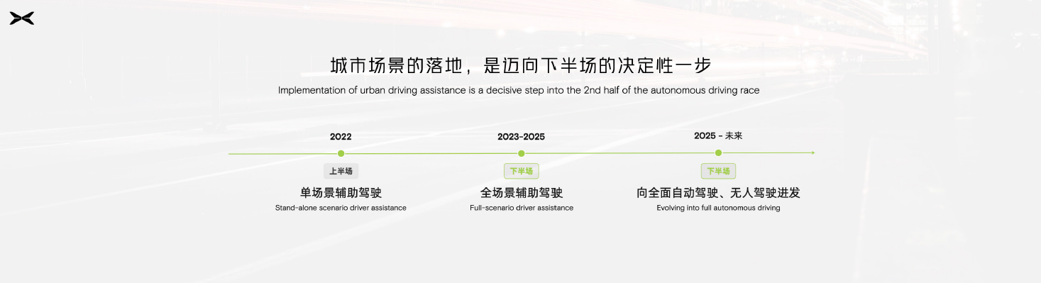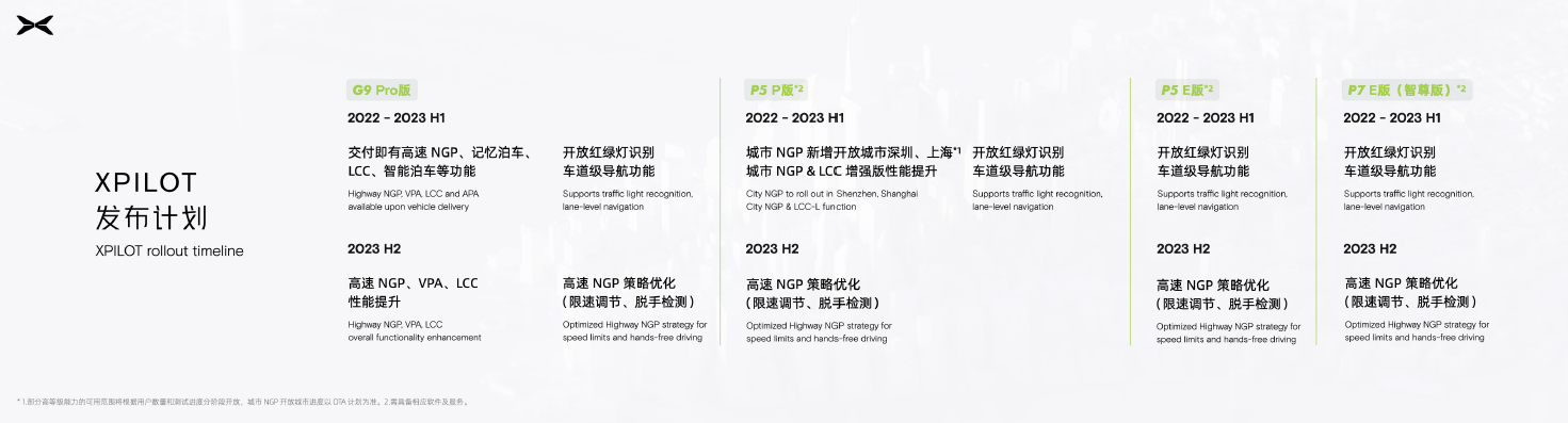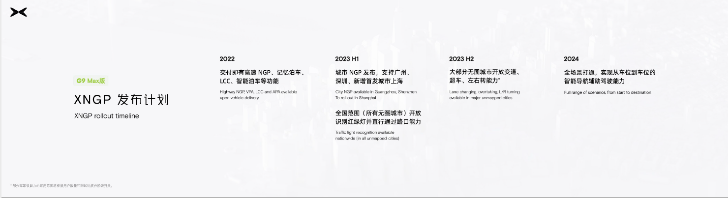在軟硬件體系帶來的高效率下,XNGP系統將在2023年上半年之前,除G9 Max版本車型交付即有高速NGP、記憶泊車、LCC、智能泊車等功能外,在全國範圍(所有無圖城市)開放識別紅綠燈並直行通過路口能力,城市NGP覆蓋廣州、深圳、上海三座城市。2023年下半年,大在部分無圖城市開放變道、超車、左右轉能力(部分高等級能力可用範圍將根據用户數量和測試進度分階段開放),2024年完成全場景打通,實現從車位到車位的智能導航輔助駕駛能力。此外,針對XPILOT版本的用户,小鵬的智能輔助駕駛能力也將持續更新。2022年起至2023年上半年,小鵬G9 Pro版在交付即有高速NGP、記憶泊車、LCC、智能泊車等功能基礎上,開放紅綠燈識別、車道級導航功能,該功能在小鵬P5 P版、E版,小鵬P7 E版、智尊版也將開放,小鵬P5 P版的城市NGP將新增開放城市深圳、上海,城市NGP與LCC增強版性能也將進一步提升。2023年下半年,小鵬G9 Pro版的高速 NGP、VPA、LCC 將迎性能提升,以上所有版本車型的高速NGP功能也將在該周期內迎來在限速調節、脱手檢測方面的策略優化。(注:城市NGP城市開放進度以OTA計劃爲準,部分功能升級需具備相應軟件及服務)