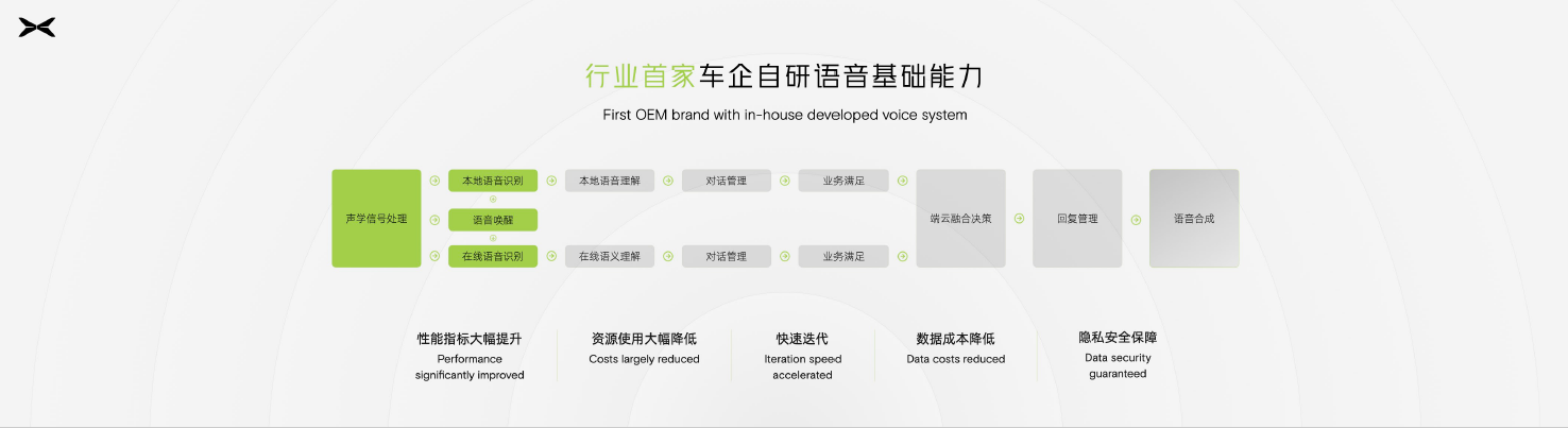 除此以外,小鵬汽車也作為行業首家自研語音基礎能力的車企,包含聲學信號處理、本地語音識別、在線語音識別及語音喚醒等方面。這將幫助小鵬解決新一代系統下,對信號處理的更高要求,解決更高複雜度的語音問題,使性能指標大幅提升,如回聲消除最多可支持30dB,識別準確率高達97%,錯誤率相比非基礎能力自研,標準安靜場景降低7.7%、中英文混合場景降低7.16%、噪聲環境場景降低36.79%、帶地域口音場景降低33.84%。同時,自研語音基礎能力也讓語音的CPU使用率降低65.9%,內存使用降低42.3%,優化工程能力的同時實現快速迭代、用户隱私安全保障,降低數據成本。
