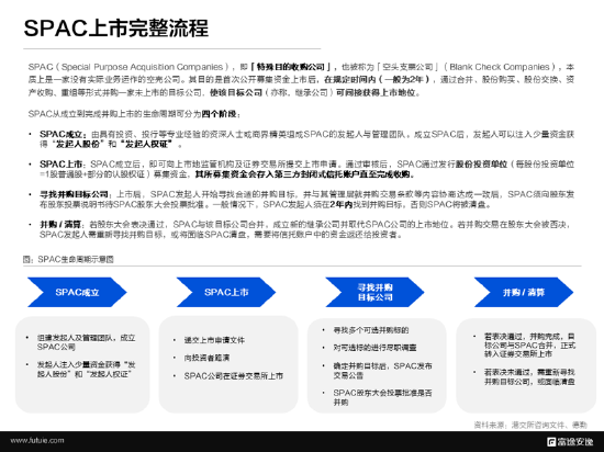 尋找併購目標公司:上市后,SPAC發起人開始尋找合適的併購目標,並與其管理層就併購交易條款等內容協商達成一致后,SPAC須向股東發佈股東投票説明書待SPAC股東大會投票批准。一般情況下,SPAC發起人須在2年內找到併購目標,否則SPAC將被清盤。