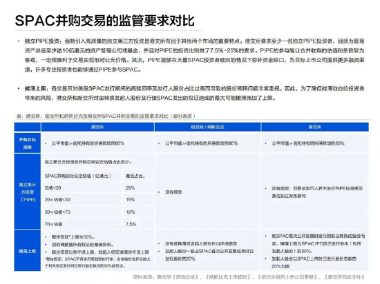 獨立PIPE投資:強制引入高質量的獨立第三方投資是港交所有別於其他兩個市場的重要特點。港交所要求 至少一名獨立PIPE投資者,且須為管理資產總值至少達10億港元的資產管理公司或基金,並且對PIPE的投資比例做了7.5%-25%的要求。PIPE的參與能讓合併收購的估值和條款較為客觀,一定程度利於交易實現相對公允價格。其次,PIPE能夠在大量SPAC投資者贖回的情況下彌補資金缺口,為目標上市公司提供更多融資渠道,許多專業投資者也能夠通過PIPE參與SPAC。