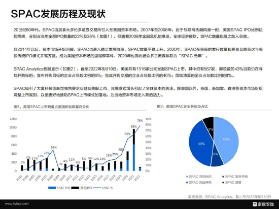 SPAC Analytics數據顯示,截至2022年8月10日,美國共有1316家公司發起SPAC上市,其中約有567家,即總數的43%目前仍在尋找併購標的;宣佈併購目標的企業佔總數比例的9%;完成併購交易的企業佔總數比例的40%;面臨清算的企業佔總數比例的8%。