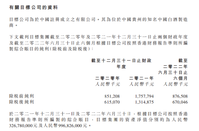 財務數據方面,2021年全年及今年上半年,金沙酒業除稅后純利分別約為13.1億元及6.7億元;資產淨值分別分別為3.27億元及9.97億元。