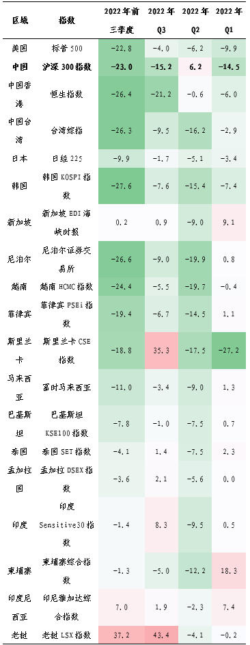 2022年以來,受到俄烏衝突推升通脹、新冠疫情衝擊供應鏈、以及主要發達國家貨幣政策轉向的影響,全球股市劇烈動盪,亞洲股市連續三個季度下跌。