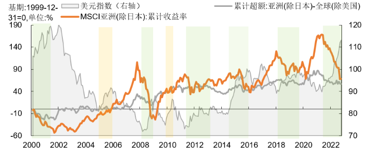 一方面,美元指數走強時期,MSCI亞洲(除日本)指數往往趨於下跌,相對於全球非美經濟體的超額收益也隨之走弱。典型時期有:1)2000年初至2001年6月,互聯網泡沫破裂,美元指數自101.8升至119.5,同期MSCI亞洲(除日本)指數累計下跌了41.5%,跌幅高於全球的24.2%及非美經濟體的28.3%。2)2008年3月至11月,國際金融危機衝擊下,美元指數自71.8升至86.55,同期MSCI亞洲(除日本)指數累計下跌了62.4%,跌幅高於全球的48.5%及非美經濟體的54.3%。