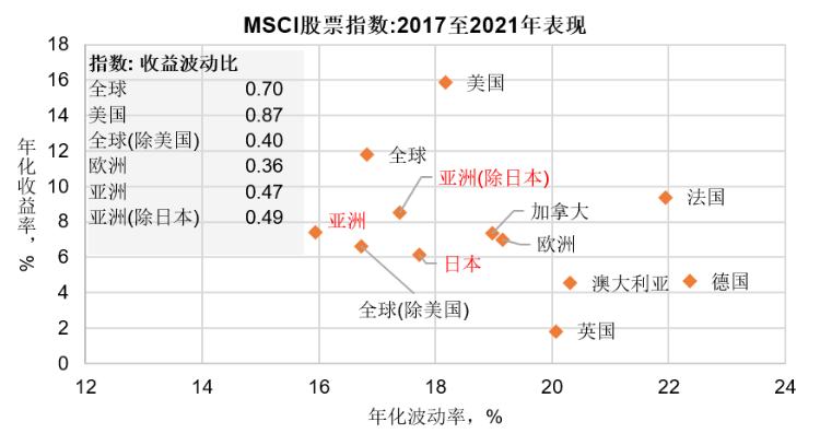 從中長期角度看,亞洲股票市場風險收益表現較好,在全球化投資中具備較好的配置價值。我們統計了最近5個自然年度(2017至2021年)的股票市場表現:MSCI亞洲指數年化收益率約7.4%,相比MSCI歐洲、全球(除美國)指數分別高出0.44、0.81個百分點;MSCI亞洲指數的年化波動率約15.9%,相比MSCI歐洲、全球(除美國)指數分別低3.22、0.79個百分點。由此看,亞洲股票市場(尤其是剔除表現相對穩定的日本市場后)的長期收益表現較好,且波動率相對較低。
