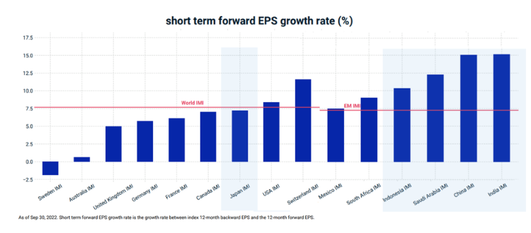另一方面,相比於其他地區而言,亞洲主要經濟體的EPS預期增速依然較高。據MSCI截止2022年三季度末的預測,未來12個月日本股票的EPS增速高於澳大利亞、英國、德國、法國、加拿大等發達經濟體;印度、中國、沙特阿拉伯、印度尼西亞等亞洲主要經濟體的EPS增速高於新興市場國家整體水平。
