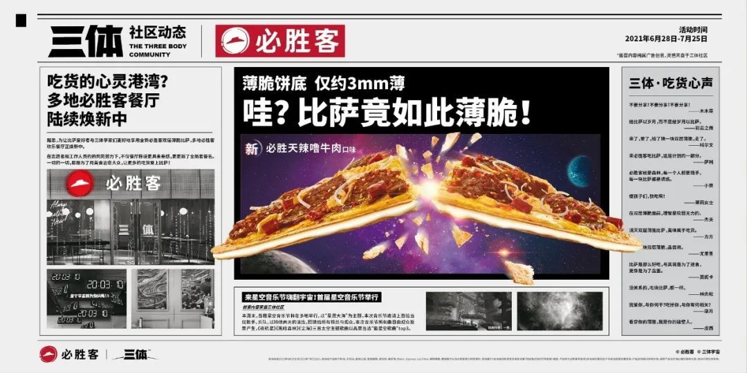 必勝客旗下的雙層薄脆披薩連續3年的營銷路線都是「科技範兒」,「用科技的方式去詮釋比薩的薄脆」。第4年,必勝客終於遇到了《三體》。儘管聯名產品和《三體》真的沒有太大關係,但衝着印刷了大量經典臺詞的宣傳圖,你能説它們之間真沒一點關係?