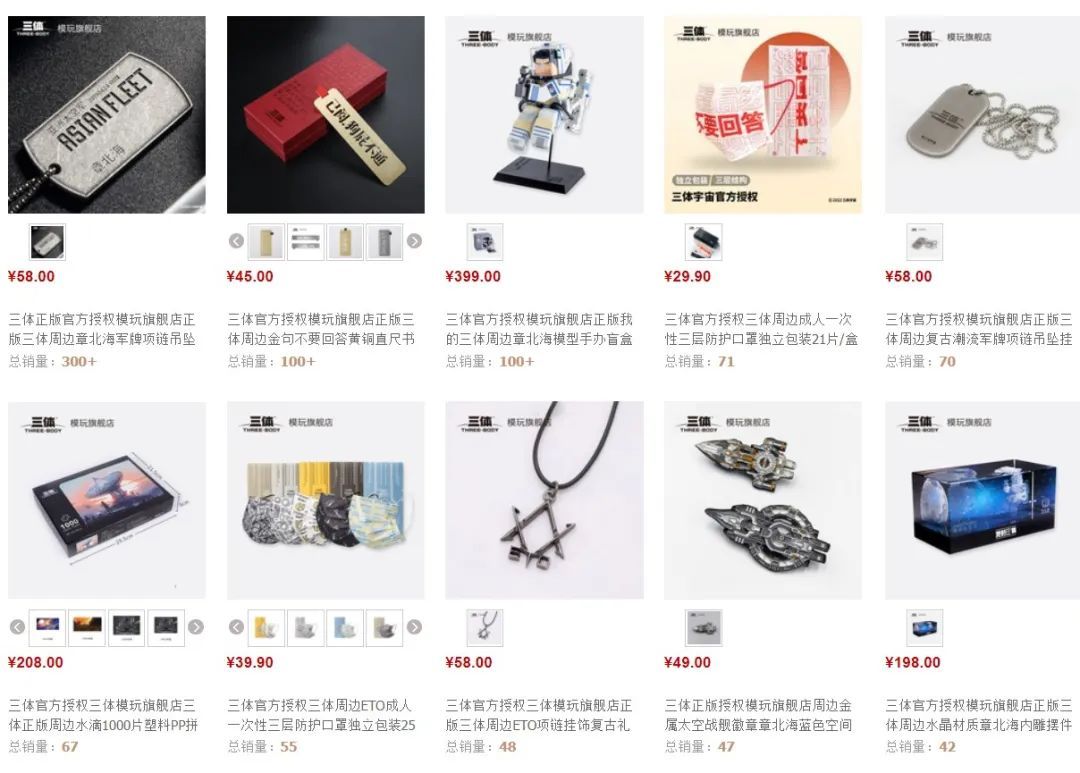 實際上,在IP的衍生開發和授權聯名的過程中,具象化的符號是最有利於建立商品和粉絲之間的直接聯繫,而具象化的符號需要通過影視化內容構建。 打開天貓《三體》模玩旗艦店,商品銷量最高的分別是章北海的軍牌吊墜、刻有臺詞的直尺和章北海手辦,縱觀整個旗艦店,大量商品都出自同人動畫《我的三體》。 作為被遊族收購的同人動畫,《我的三體》影響力一直維持在覈心粉絲層面,這也造成了衍生周邊的銷量相較於小説完全不值一提,但是從這些商品卻可以凸顯出小説被具象化后在衍生開發、聯名合作方面所具備的明顯優勢。