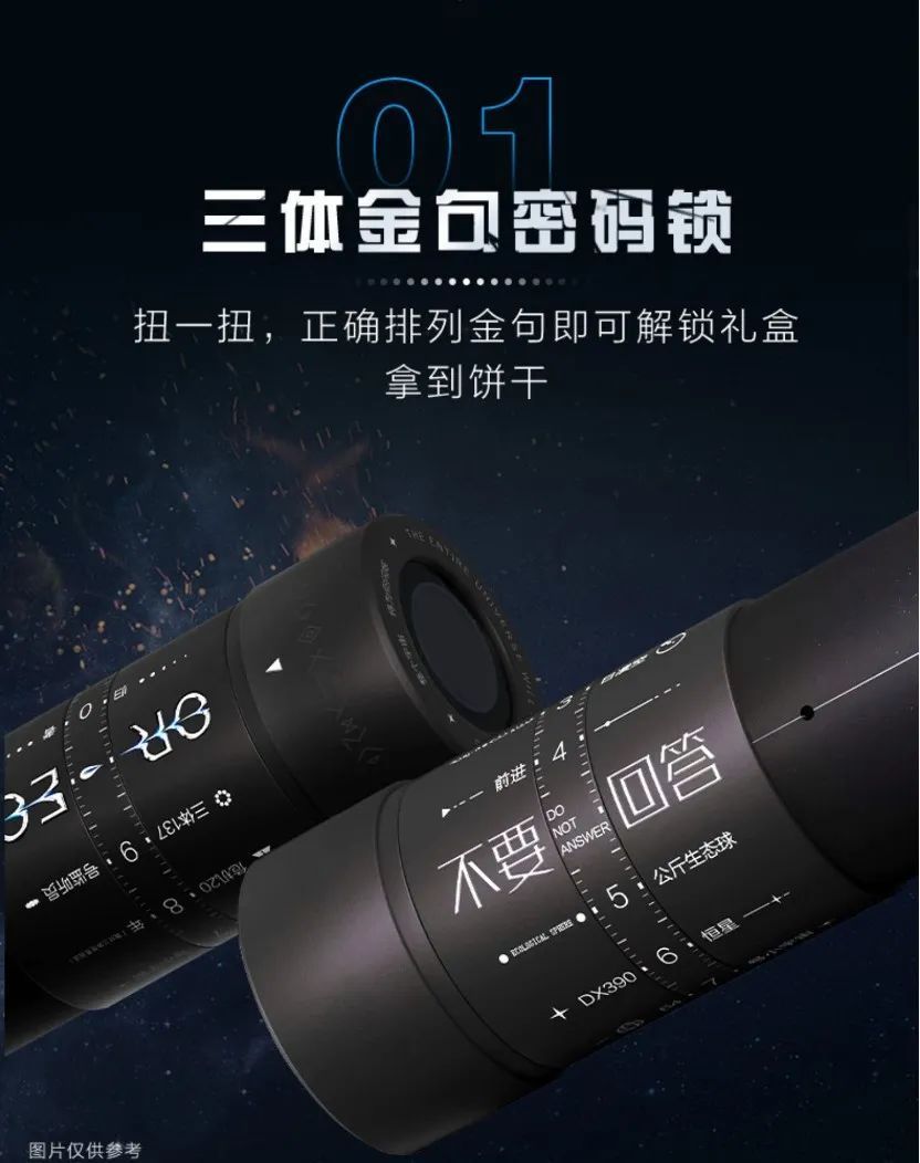 比如奧利奧與《三體》聯名推出的禮盒,包括「炫目深淵鏡」「朝酷投影」和「三體金句密碼鎖」,看得出來在設計方面是頗費心思。和《三體》有最直接關聯是「金句密碼」這一項,而將《三體》各個關鍵詞印在餅乾上進行銷售,成爲了這次聯動商品銷量提升的直接手段。