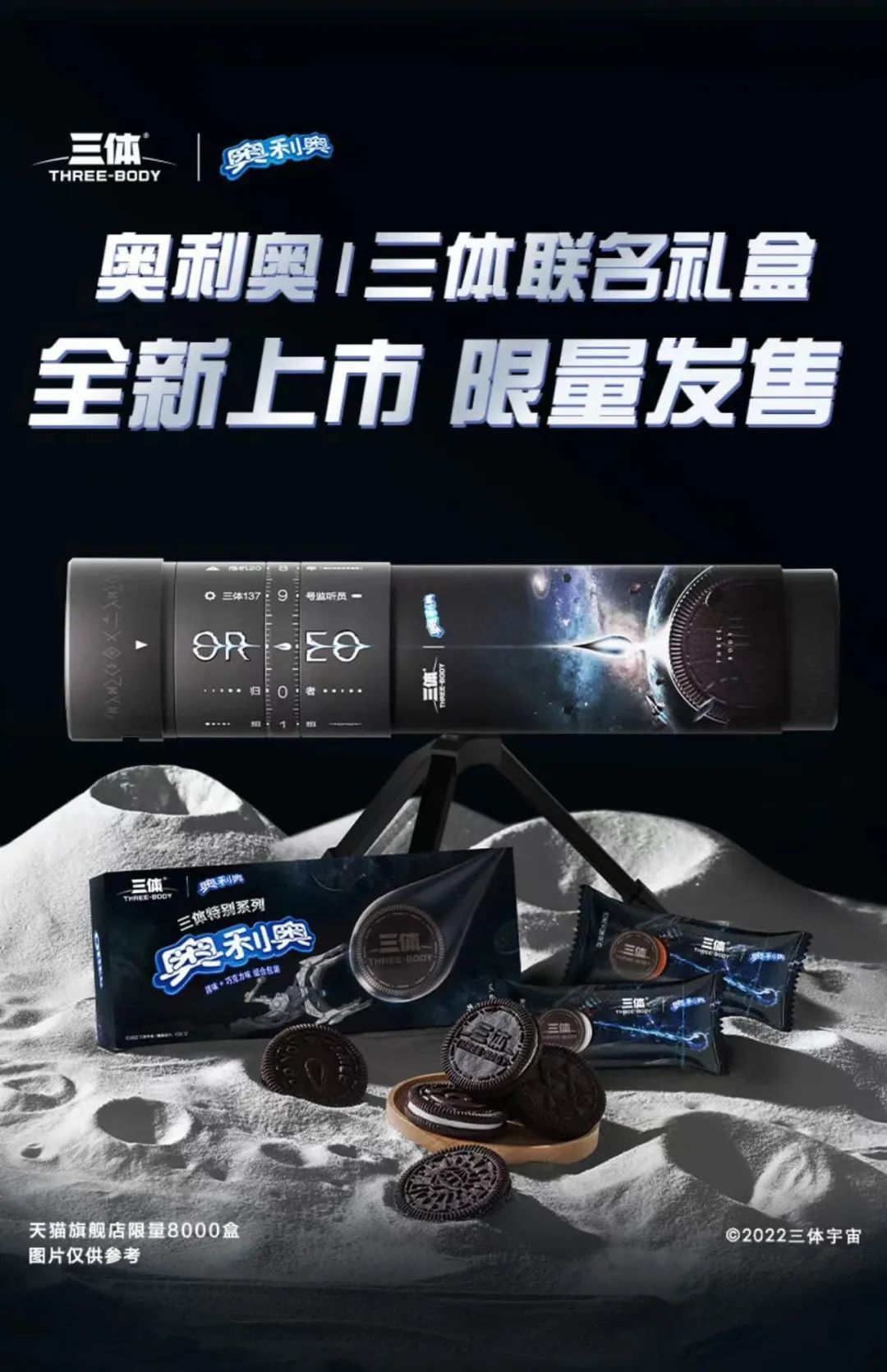 10月17日,奧利奧在天貓小黑盒首發《三體》聯名禮盒。特價199元的預售禮盒里只有一份奧利奧餅乾,「買櫝還珠」的意味稍微有些重,不過3個晚上的直播賣出去了超過1000個。同時,另一組到手價格55元的聯名餅乾組合禮包也賣出去了近4000份。一直被視作硬核科幻代表的《三體》,與快消品的聯名也能產生相當規模的銷量,這或多或少能從商業角度證明《三體》早已跨出了小眾科幻圈,正走在擁抱大眾的路上。