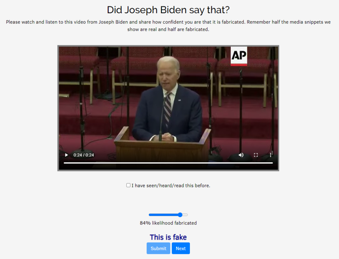 除了以上的理論知識,你還可以試着去這個網站https://detectfakes.media.mit.edu/)實操做題,提升一下自己鑑別假視頻的能力,説不定還能幫科學家對抗使用AI換臉的不法行為。