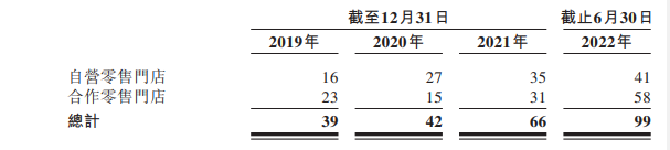 經歷了2019年下半年至2020年下半年的劇烈開關店后,蕉下逐漸恢復了開店節奏,2021年新開24家門店(8家直營店和16家加盟店),2022年上半年新開33家門店(6家直營店和27家加盟店)。截至2022年上半年,蕉下共有99家門店中,有41家自營零售門店和58家合作零售門店。