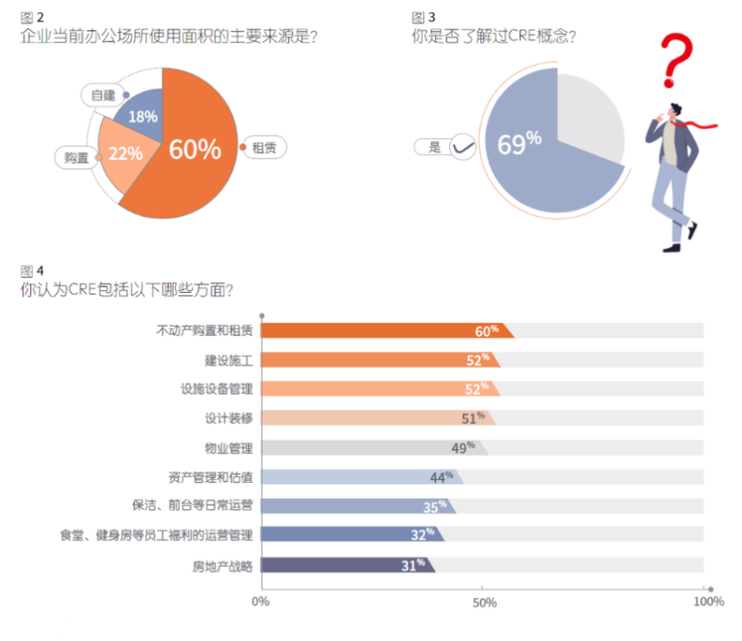 仲量聯行發佈首個企業不動產調研報告表明,儘管69%的受訪企業表示曾瞭解甚至踐行過企業不動產(Corporate Real Estate, CRE)的概念,但是認知尚不成體系,大部分企業沒有將不動產相關的各類工作通盤看待,更沒有將不動產事務納入企業戰略考量。