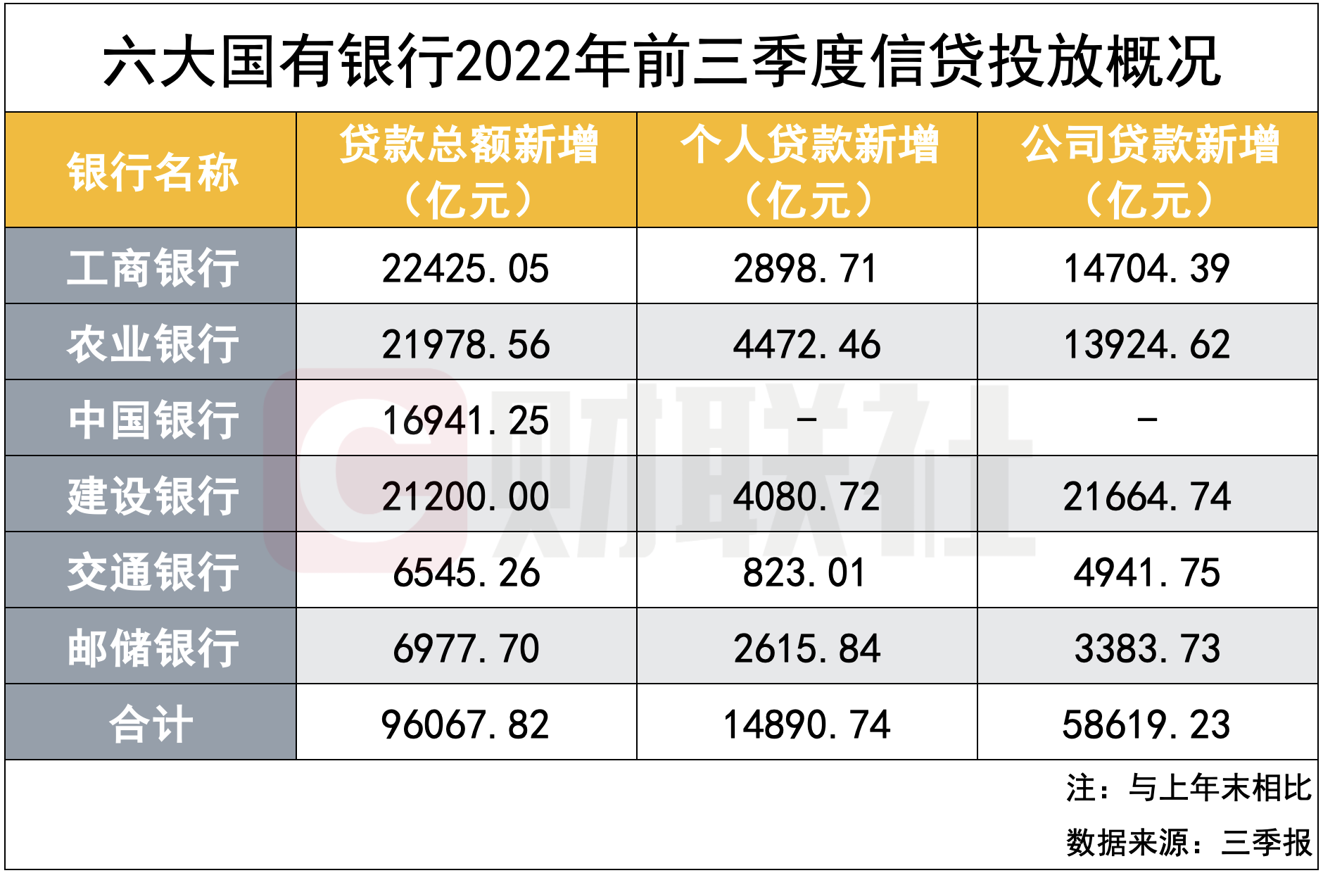 細分來看,據財聯社記者統計,與上年末相比,五大行(中行未披露)公司類貸款合計增量約5.86萬億元,其中建行貢獻2.17萬億元,截至三季度末該行公司類貸款為11.76萬億元,工、農、建也貢獻超1萬億元;另一方面,五大行個人貸款合計新增近1.49萬億元,其中增量最多為農行的4472億元。