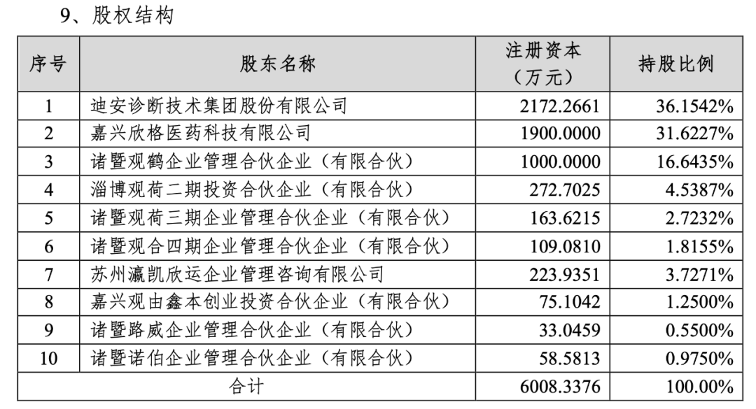 公告顯示,迪安診斷持有觀合醫藥36.15%股份。值得一提的是,在公佈的股權結構名單中,位於第八至第十位的鑫本創業(持股1.25%)、諸暨路威(持股0.55%)和諸暨諾伯(持股0.975%)是最近剛增資擴股新引進的股東。根據迪安診斷9月13日的公告,上述股東各增資500萬元、220萬元和390萬元。據此金額及持股比例測算,觀合醫藥的最新估值為4億元。