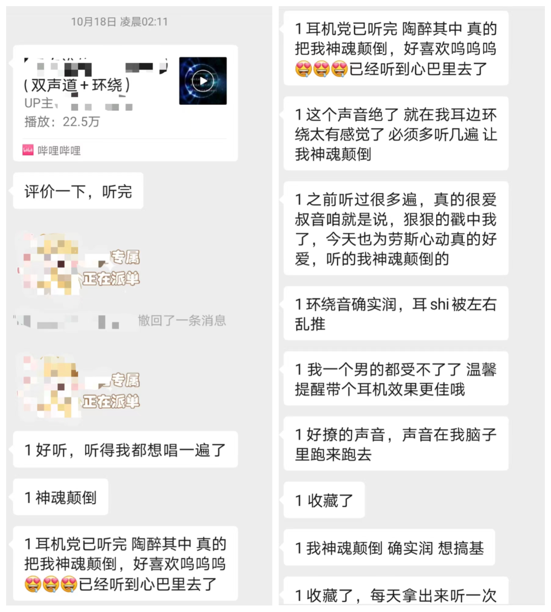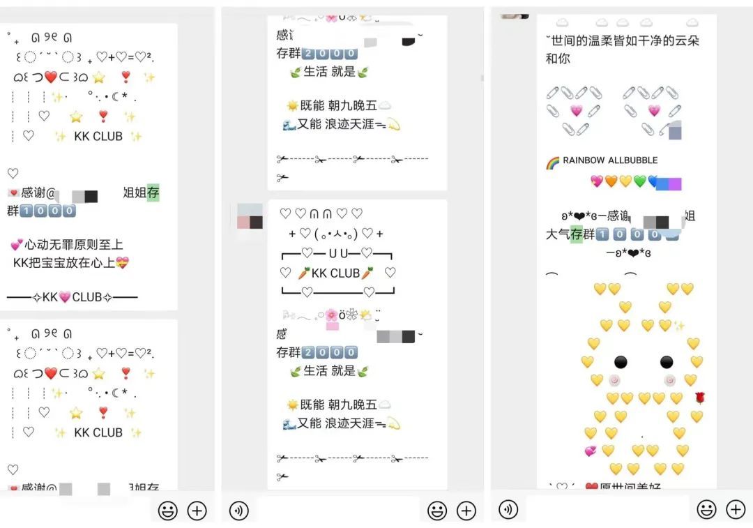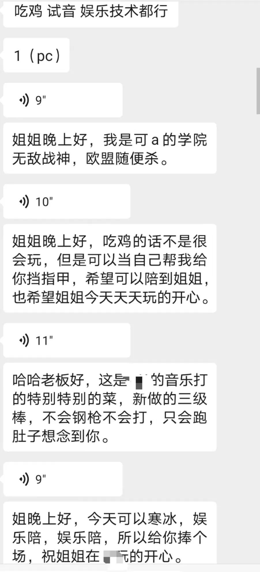 平時兩人出手相當闊綽,時不時就在羣里送禮物。所以每當她們出現時,羣里就很熱鬧。有一天,KK在羣里發了一首歌曲的視頻鏈接,讓羣里的人聽完説説感受。羣里很快就被刷屏了,能看得出每個陪玩都竭盡所能地找出不同的形容詞,以搏老闆歡心。