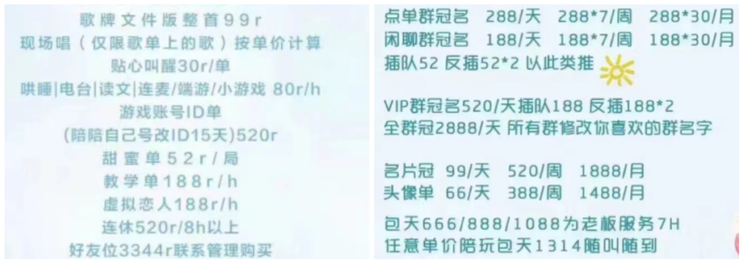 很快,熊貓發來一張服務清單,上面標着俱樂部可以提供的服務項目和價格。項目包含王者榮耀、和平精英、LOL的陪玩服務,歌單、哄睡、電臺、連麥、小遊戲等陪伴類服務,此外還有頭像單、羣冠名、虛擬戀人、好友位等附加服務,價格也從20元到3344元不等。