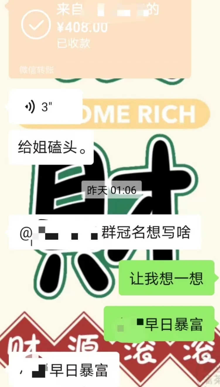 想象中,那種對待老闆的熱情態度並沒有出現。在羣里發起轉賬后,只有小宇很快收了錢,隨后回覆了「1」。阿新卻迟迟沒有出現,直到第二天轉賬快要過期時,他才收了錢,但仍然沒在羣里説過話。