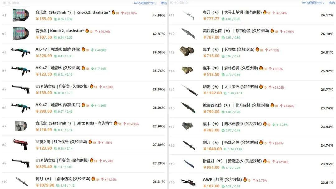 「再低,收益率也不會低於10%。」投資者阿樂很有信心。第三方檢測網站CSOB的數據也顯示,《CSGO》熱門遊戲飾品的年化收益率大多在10%-20%以上,部分皮膚甚至能達到50%的年化收益。