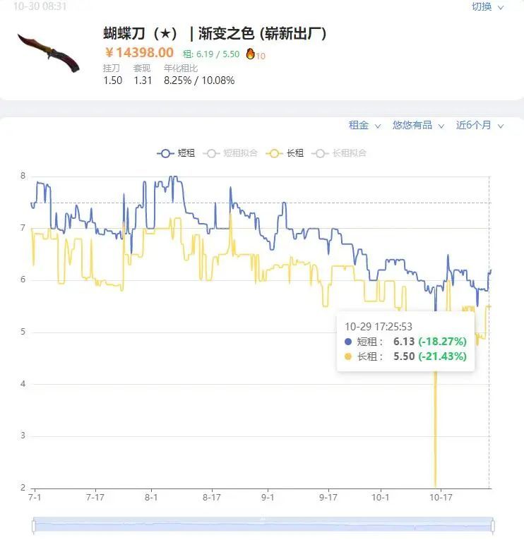 競爭激烈是最主要的原因。理論上,皮膚租賃幾百元就能入場,門檻遠低於大多數生意。供給端逐漸飽和之后,市場價格也一路下探,比如大火的「蝴蝶刀」,儘管價格上漲了一半,但出租價格卻從每天12元降低到了6元,租售比只有原來的四分之一。