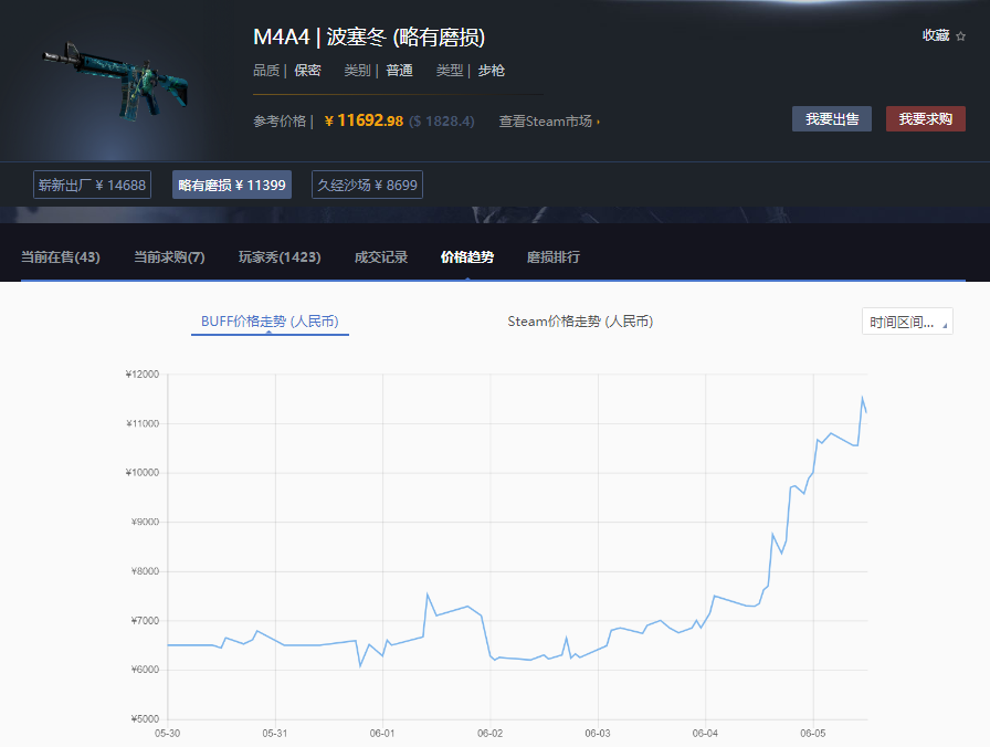 它的波動也如同股市。從2012年《CSGO》這款遊戲誕生開始,皮膚市場就伴隨着玩家和投機者的入場歷經多次「牛市」。進入2022年,伴隨着現實生活中的股市下跌,房市遇冷,投資標的匱乏,越來越多的理財者也瞄準了遊戲皮膚的市場,共同將遊戲飾品的價格推向了一個新的高潮,本來就貴的遊戲飾品,更是屢屢刷新人們對它的價值認知。