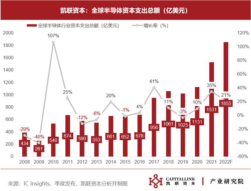 疫情以及國際政策等因素推動了近三年半導體廠商的擴產浪潮,2020-2022年全球半導體行業資本支出預計將連續三年保持兩位數增長,資本支出總額屢創新高,根據IC Insights預測2022年半導體資本支出有望增長21%至1855億美元。