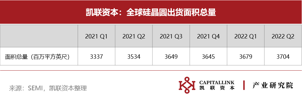 材料端:2022年第二季度全球硅晶圓出貨量超過了今年第一季度創下的歷史新高,同比增長1%,達到3704百萬平方英寸。第二季度硅晶圓出貨量比去年同期的3534百萬平方英寸增長了5%。