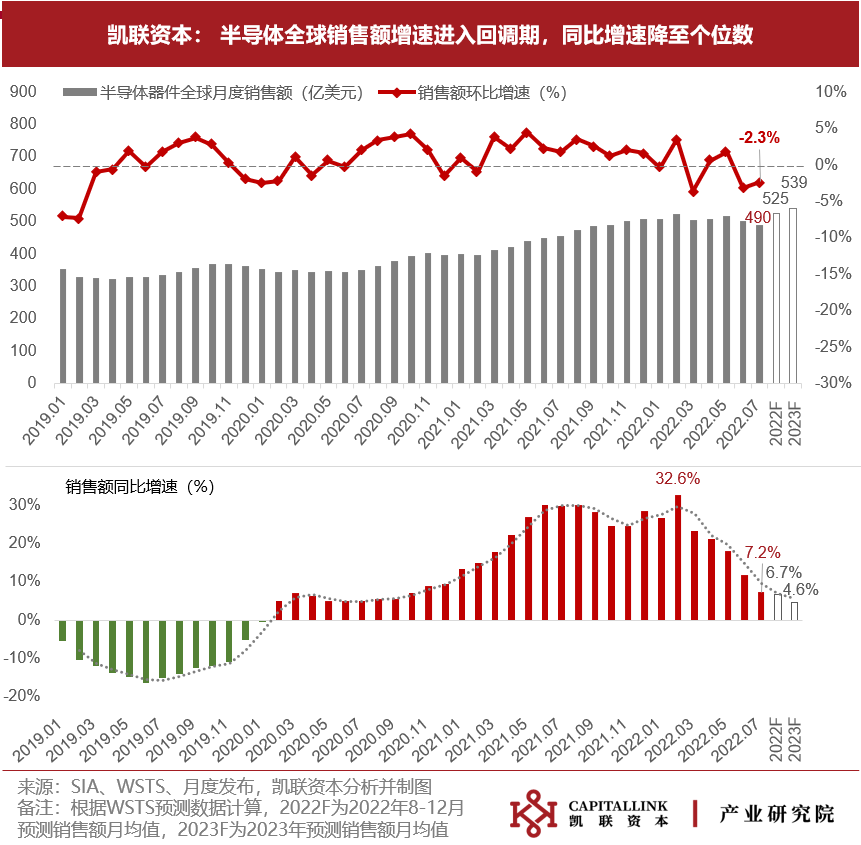 根據世界半導體貿易協會(WSTS)及美國半導體行業協會(SIA)發佈月度數據:2022年7月全球半導體行業銷售額為490億美元,同比增長7.2%,環比下降2.3%。本輪周期自2022年2月達到銷售額頂峰后,銷售增速大幅放緩:從同比增速來看,該數據已接連出現5個月下滑,並於2022年7月駛入個位數增速區間;從環比數據來看,Q2較Q1環比下降0.6%,7月較6月數據環比下降2.3%。主要原因是個人消費放緩,導致PC和智能手機出貨下滑。據此,WSTS全面下調了2022年全球半導體市場增長預期至13.9%(2022年8-12月全球半導體銷售額預測月均值約525億美元)及2023年增長預期至4.6%(2023年全球半導體銷售額預測月均值約為530億美元) 。
