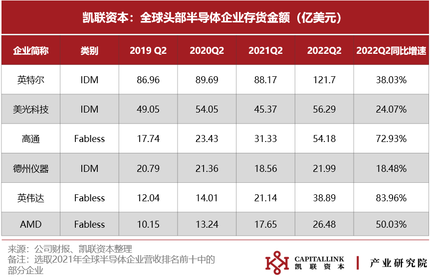 聚焦世界頭部半導體企業來看,存貨積壓態勢明顯;其中英偉達2022Q2存貨金額同比增速高達83.96%,高通存貨同比增速達72.93%。主要原因在於高通脹影響下,消費性產品需求疲軟,終端買方採購需求明顯下滑,進一步導致供應商庫存壓力提升。