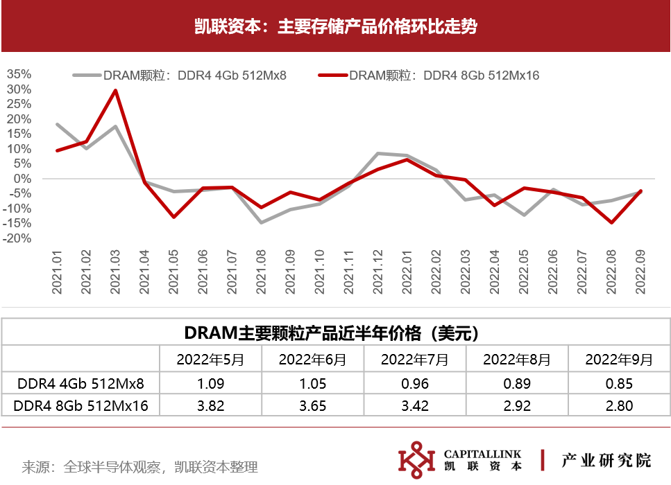 消費電子產品銷售下滑,主要產品廠商進入去庫存階段,進而導致了存儲芯片行業的下行壓力。當前DRAM內存芯片的售價降到了近兩年新低,以DDR4 4Gb 512Mx8為例,2022年9月已降到0.85美元,環比下降4.5%,同比降幅為35.1%。