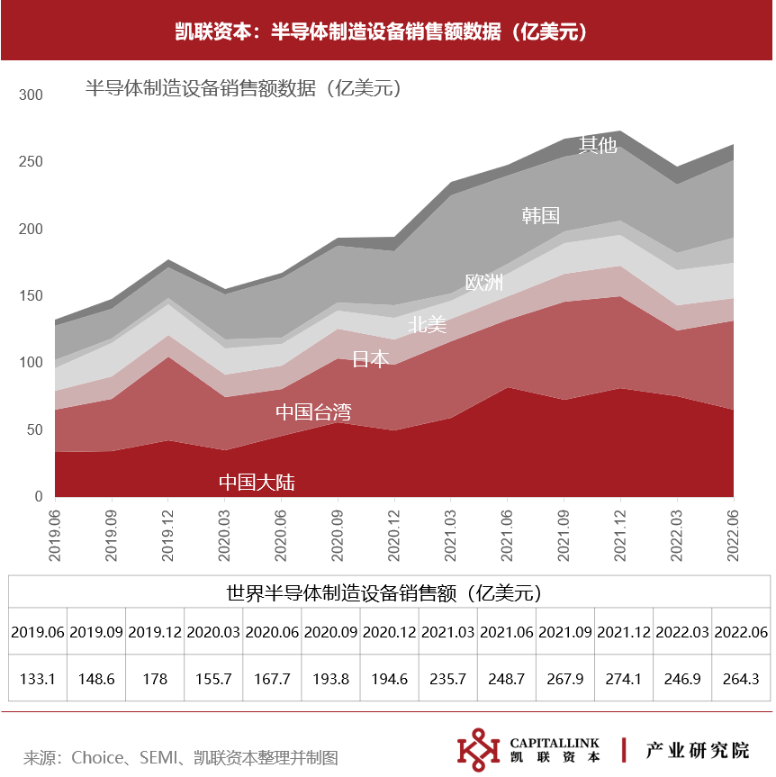 設備端:2022年第二季度全球半導體設備出貨金額達到264.3億美元,同比增長6%,環比增長7%。其中中國臺灣及中國大陸為前兩大市場。