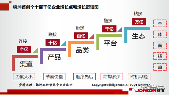 以此類推,隨着企業規模的不斷擴大,核心增長點也逐漸升級到了品類、平臺和生態。不同的層級都有相應要做的品牌頂層設計和規劃,把點打透、以線拉通、用面成型、多面定體、空賦能點。