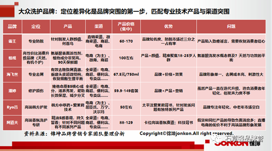 傳統大眾洗護品牌目前主要以功效的卡位來打開產品的差異點,並通過專業技術為產品背書,以渠道的組合佈局進行市場突圍。
