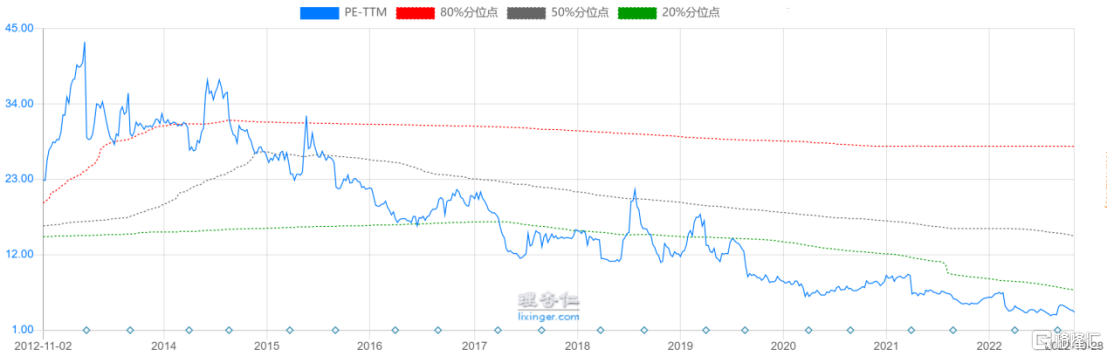 圖1.天倫燃氣PE(TTM)位於近十年曆史低點