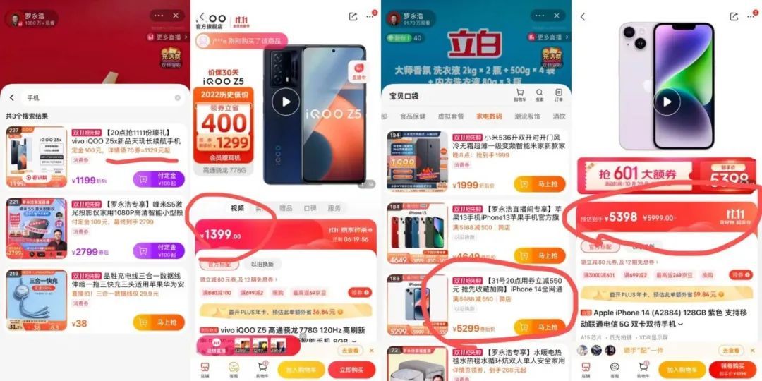 羅永浩直播間的VIVO IQOO z5手機的天貓官方旗艦店售價爲1129元(起),比京東領券到手價1299元的價格便宜170元。除此之外,在10月31日當天,羅永浩直播間的iPhone 14由中國移動官方旗艦店銷售。天貓和店鋪優惠券疊加后,滿5988減550,券后價為5299元,比京東5398元的定價還便宜100元。