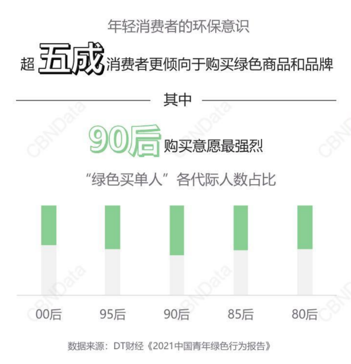與此同時,隨着人們認知水平的不斷提升,越來越多的消費者也開始在消費習慣上傾向於綠色環保品牌。根據《2021年中國青年綠色行為報告》顯示,年輕消費者的環保意識越來越普遍,超五成的消費者更傾向於購買綠色商品和品牌,「綠色買單人」羣體呈壯大趨勢。
