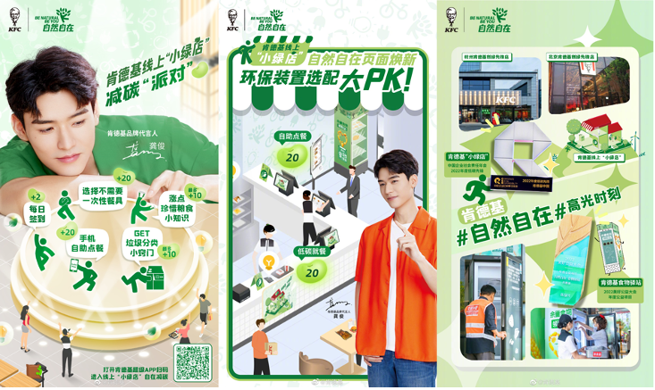 作為一直以來秉承#自然自在#的品牌可持續發展理念的品牌,除了倡導節約糧食的肯德基食物驛站之外,肯德基還開設了多家「肯德基創綠先鋒店」參與節能環保,並推出線上「小綠店」倡導低碳生活,不斷拓寬公益邊界,帶動消費者一起踐行綠色生活方式。