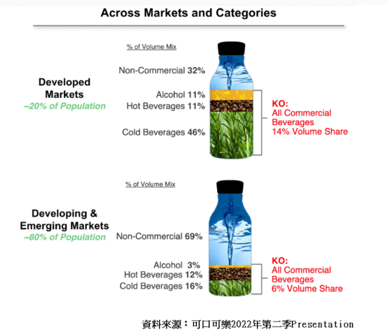 發達國家市場方面,商業化飲品約佔整體飲品量近7成。集團於冷熱非酒精飲品中,就佔去其中14%的銷量,市佔比例不輕。