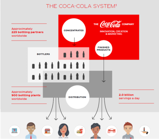 可口可樂公司將生產和銷售部份濃縮飲品、糖漿和完成品的工作,授權予全球的200多個合作伙伴。透過它們分銷至超市、餐廳、電影院、便利店等客户手中。