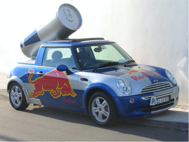 當時效力於法拉利車隊的奧地利車手傑哈德·伯格,被電視臺拍到在巴西海灘手拿銀藍小罐的飲料跑步。這瓶銀藍色的小罐子引起了所有車迷的好奇,第二天紅牛銷量大漲,經銷商們都感到有些措手不及。